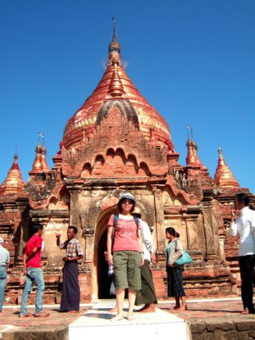 The stair steps were rather steep and narrow, I cautiously stepped out foot by foot with tension and finally went through all layers of terraces up to the round dome of Mingelazedi Pagoda to have this wonderful panorama view of Bagan Plains.